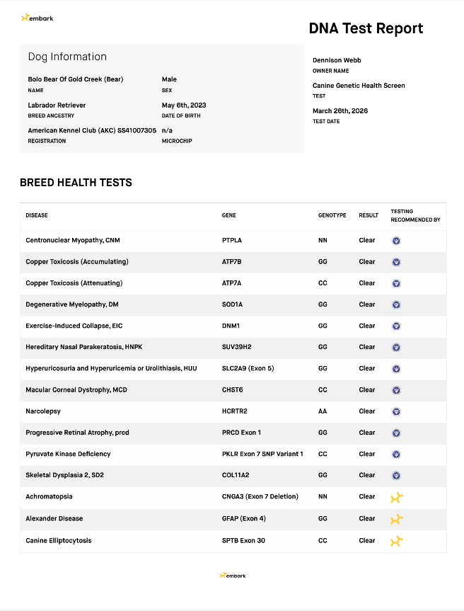 Check out the images below to view Bear's AKC Pedigree Certificate and DNA test results.